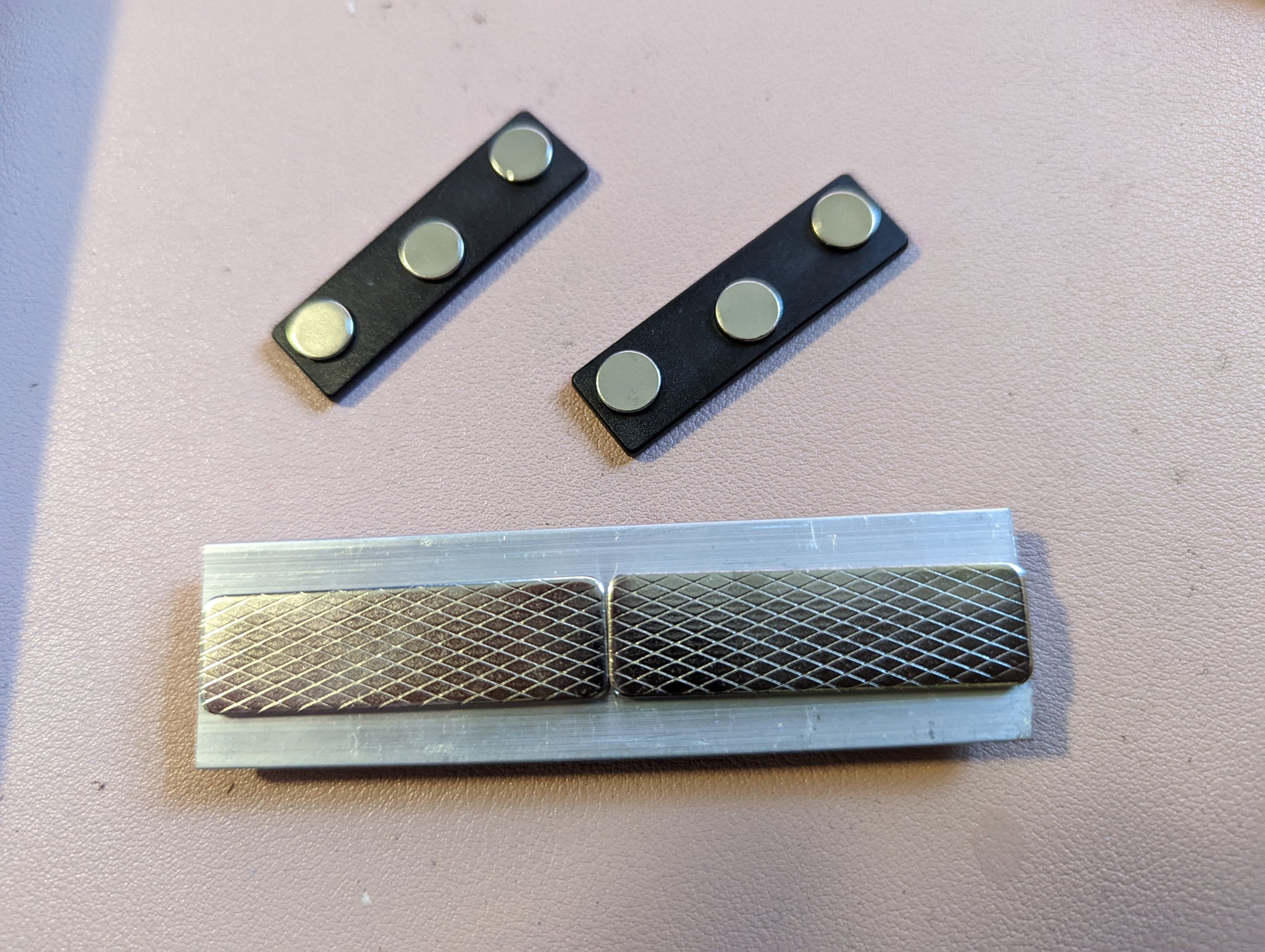 Push buttons are the larger Anthology size, and are genuine EAO industrial push-buttons. They're affixed to an aluminum bar 1" in height. Mounted on two magnet strips to easily clip to uniform.