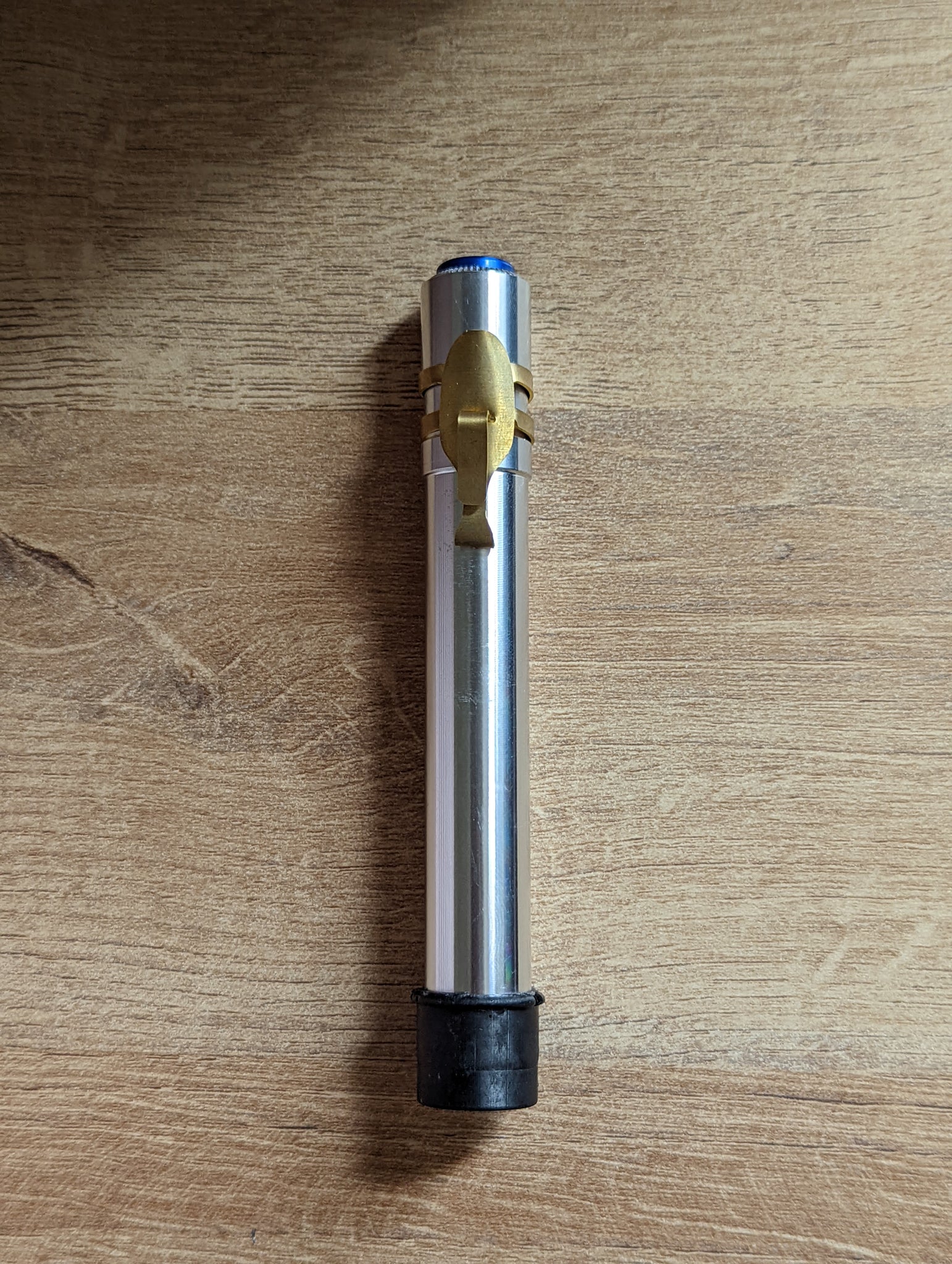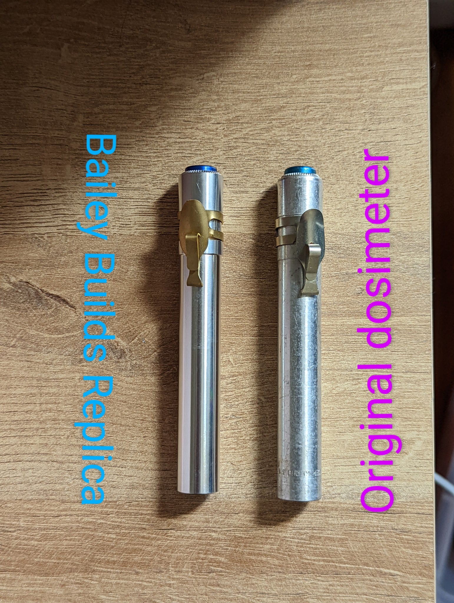 The cylinder is made to the same machined dimensions as the original dosimeters. They're affixed with an accurate blue cap, a reproduction end cap made of rubber, and a shaped metal clip in either brass or aluminum.