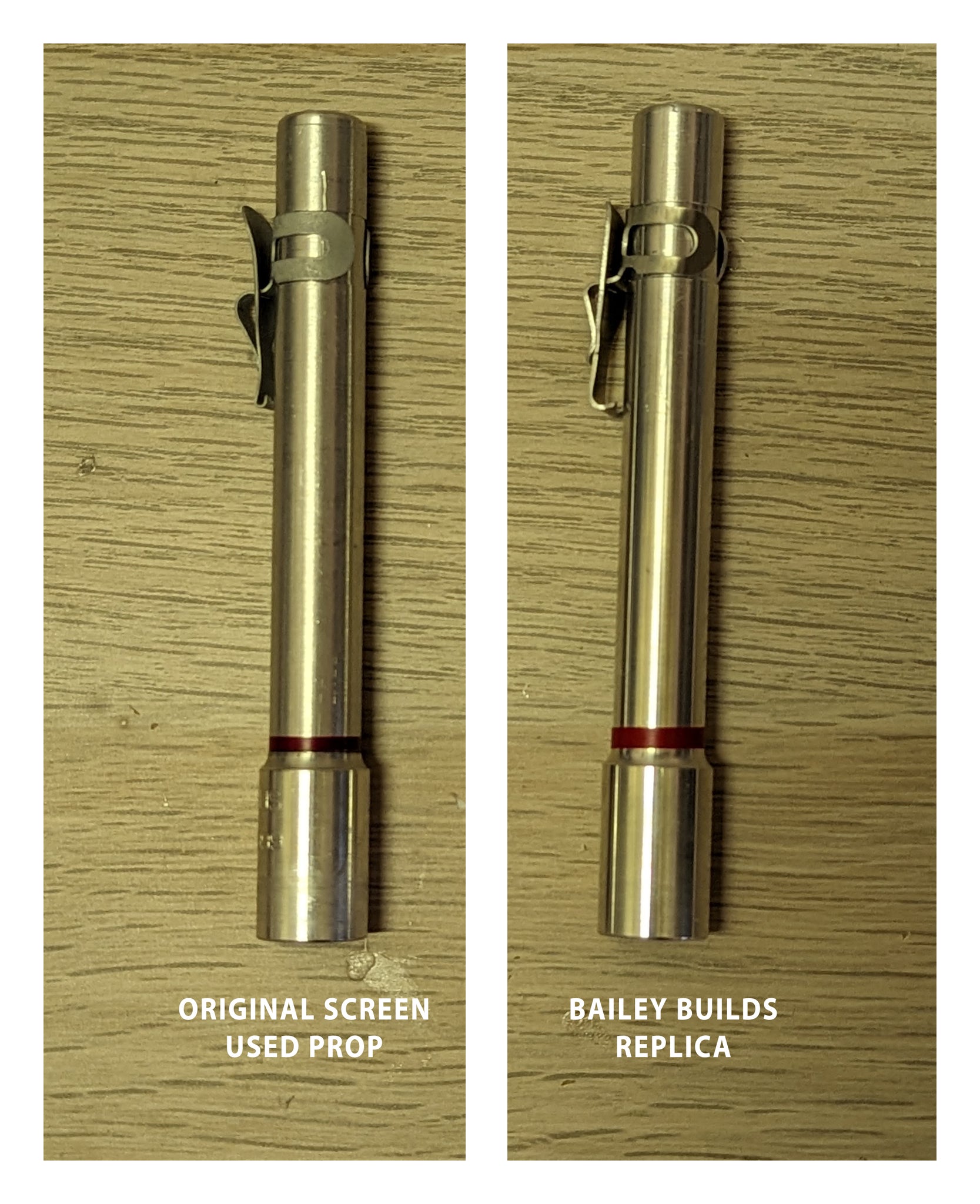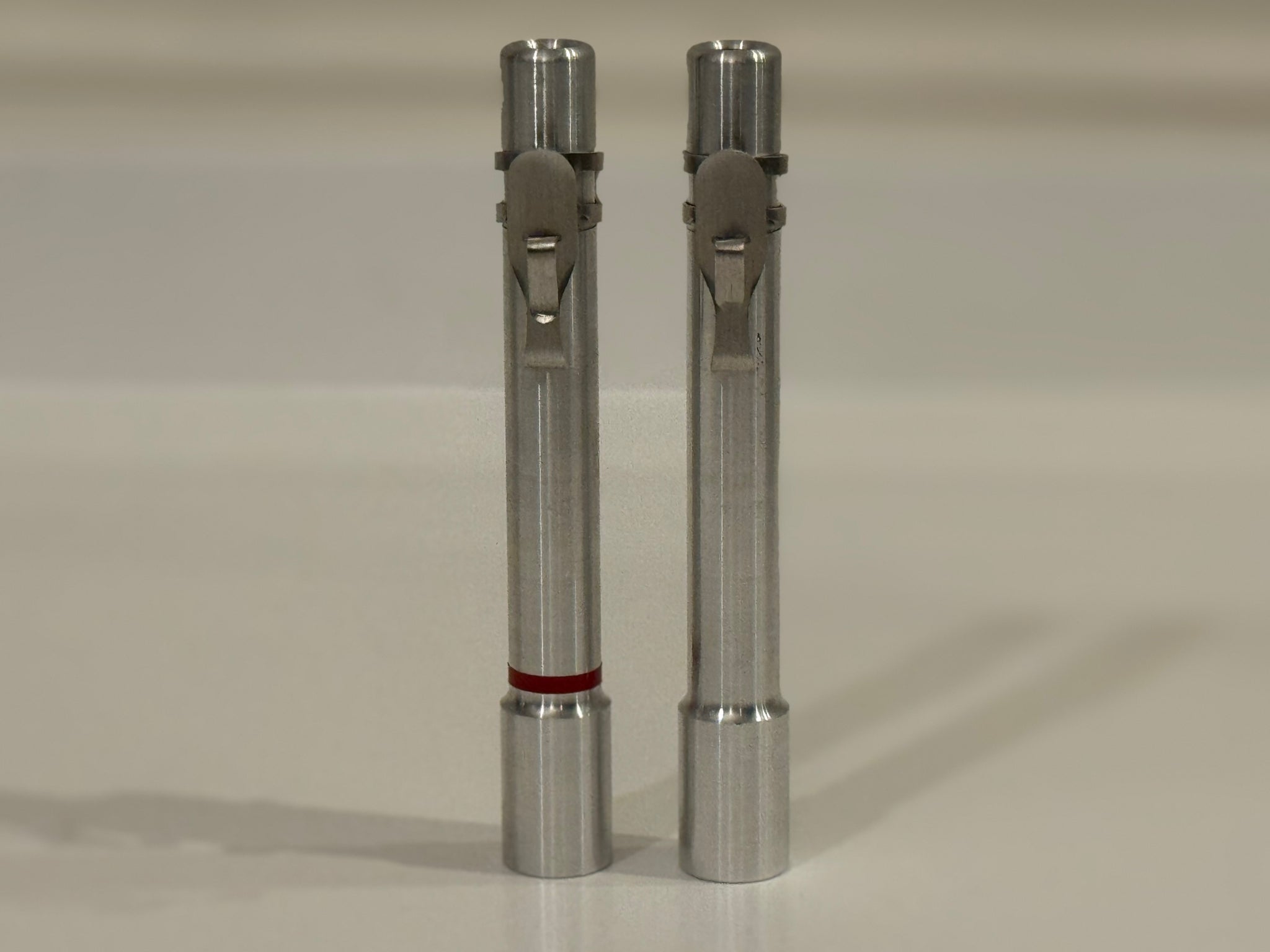 This cylinder is made to the same machined dimensions as the original dosimeters of this model. They come with a aluminum sturdy clip for attachment. Optionally they can be upgraded with a rubber end cap, and a red vinyl band to mirror the original props.